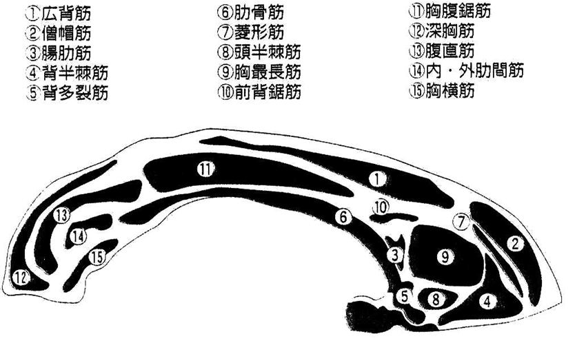 ○カタも同様に、カタの部分の僧帽筋、ロースやウデの部分の広背筋の厚みがある枝肉は歩留り・肉質が良い枝肉です。特に、枝肉骨格が大型化するにつれ、頸肩が薄い肩薄の枝肉が増加しています。モモの肉付きも同様に評価します。