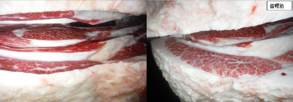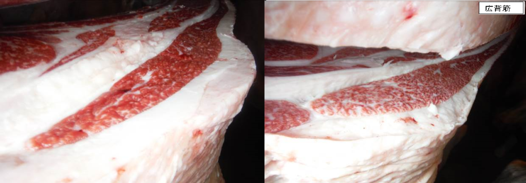 ○サイズは切開面の迫力、肉量の評価となります。日格協では、皮下脂肪を含まないバラ厚を表示しています。和牛去勢では、8.1cm(H30.1~12)が全国平均値です。胸腹鋸筋・広背筋・僧帽筋単体のサイズは日格協の統計量が存在しませんが、全農ミートフーズの内部データーでは平均は約3.5cmといったところでしょうか。