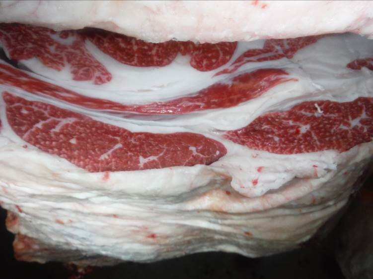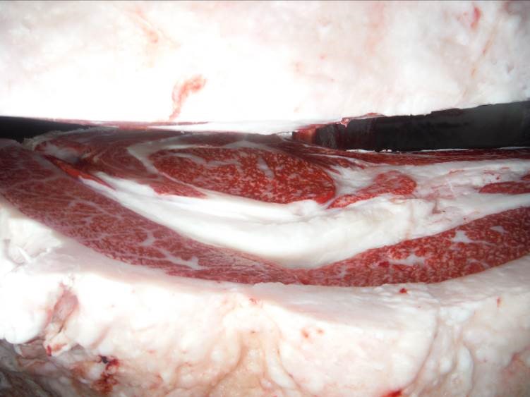 筋肉内のサシ以外の赤身の部分も、脂肪が含まれています。様々な要因でその含有率が少なくなると、枝肉の切開面に懐中電灯を当てた場合、光の透過率が高くなり、筋肉表面の色は濃く(暗黒褐色)なります。さらに、表面には筋肉内の微量の水分が浸み出し、サシ部分(脂肪細胞)と赤身(筋肉細胞)に段差が生じて凸凹の粗い表面性状となり、枝肉評価では「肉締まりが悪い、肉締まり不足」の枝肉となります(写真3)。肉締まりが極端に悪いと、コンシューマーパックでのドリップを引き起こし、日持ちが悪くなるとされています。
