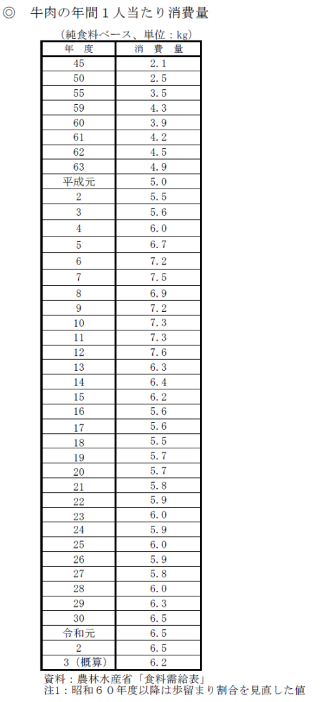 平成29~令和元年はインバウンド需要もあって漸増していました。令和3年度は、逆にインバウンドの減少が大きく影響しています。牛肉年間消費量は、年間一人当たりの(家計消費量+外食・加工し向け量)です。