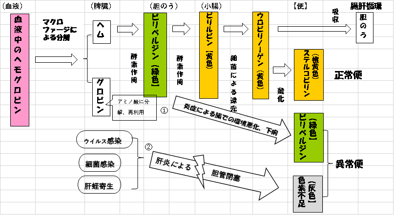 - 内臓疾患により代謝バランスが崩れると、色が変化することがあります。血液色素の代謝器官である脾臓・肝臓・胆のう・小腸機能の不全によるものとされています(下図①②)。