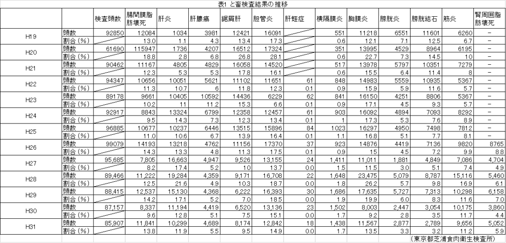 (1)東京食肉衛生検査所の統計によると、消化器官疾病のなかで肝臓関連(肝炎、鋸屑肝、胆管炎、肝膿瘍)の発生割合が多く、なかでも肝炎発生割合が増加しています(表1)。