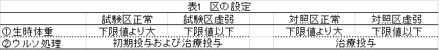 ①体重の大小ならびに②ウルソの投与時期で区を設定しました。すなわち、体重において日本飼養標準発育値下限値(雄32.9kg、牝23.9kg)を基準にそれより大きい個体を正常個体区、それ以下の個体を虚弱個体区に各区を分割し、計4区を設定しました。