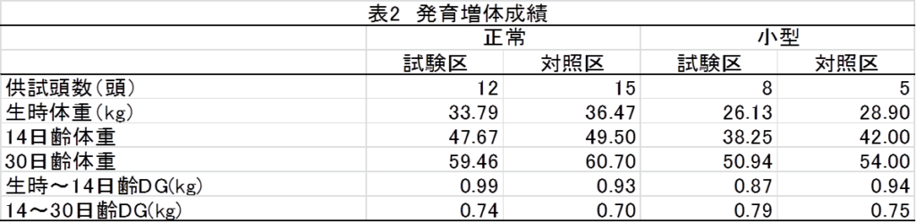 30日齢体重は、正常個体が対照区60.70(100)≧試験区59.46(98.0)と小さかった試験区が対照区とほぼ等しくなりました。