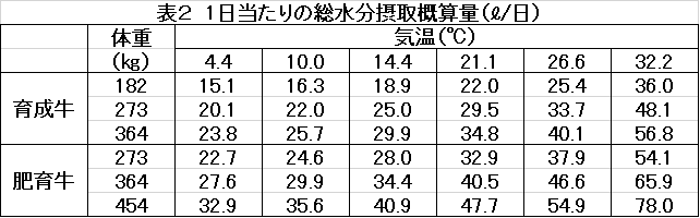 通常、自由飲水ができる場合、下表のように大きめの肥育牛は暑熱時にはドラム缶の約半分もの水を飲みます1)。